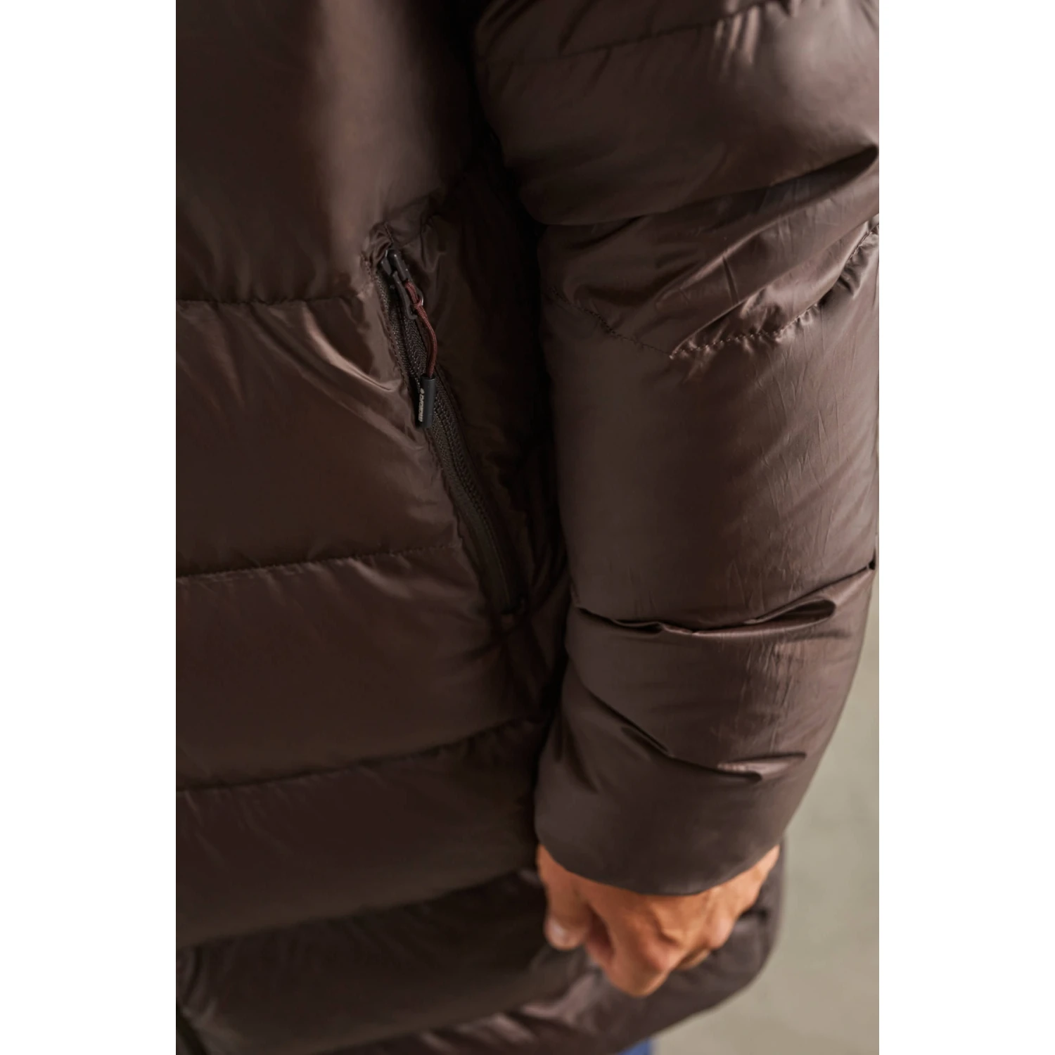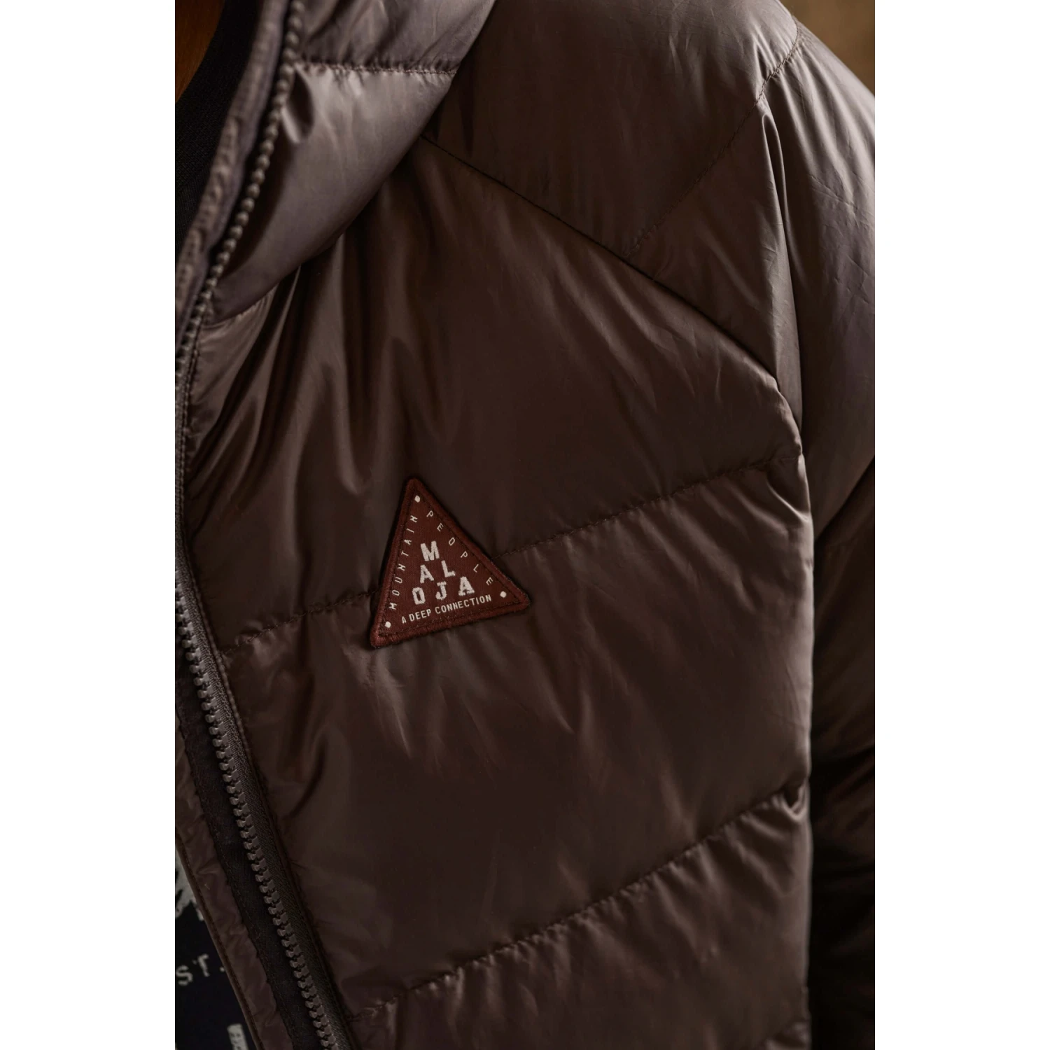 Very warm, long-cut coat with filling from recycled down. The Stormshell outer material is windproof and has a PFC-free water repellent finish. Large hood, two-way zipper, two side zipper pockets. Maloja patch on the chest.